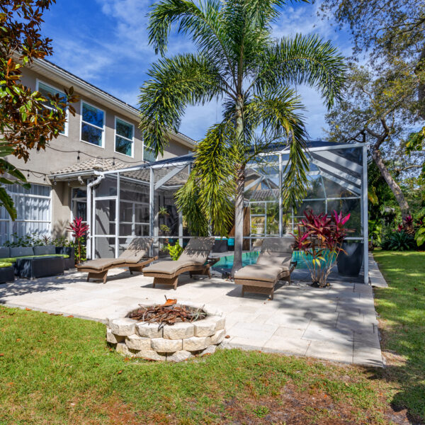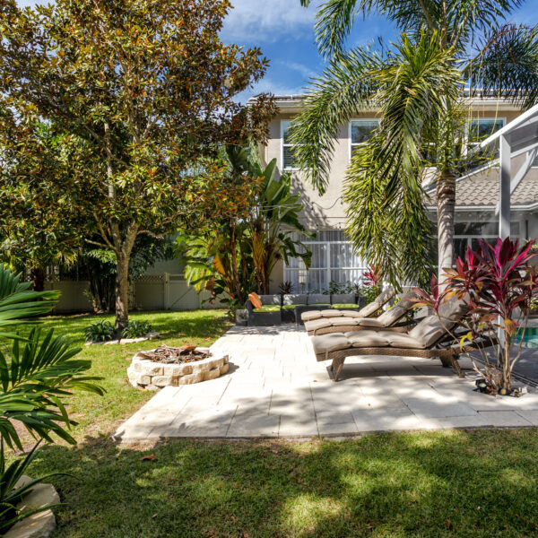 The private backyard is a true retreat, surrounded by lush mature landscaping and featuring a cozy fire pit, sun deck with loungers, and an inviting seating area — perfect for outdoor relaxation and entertaining.