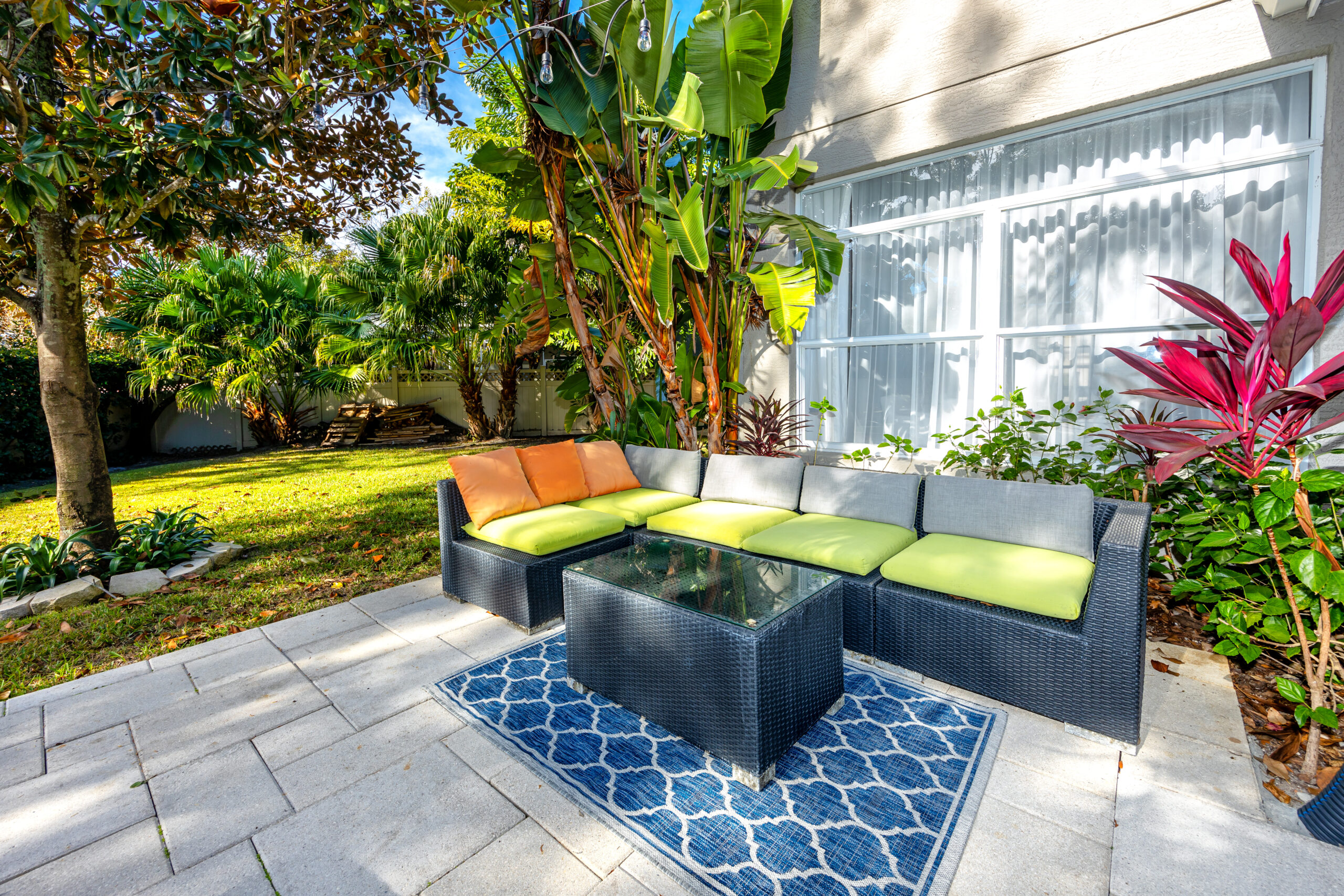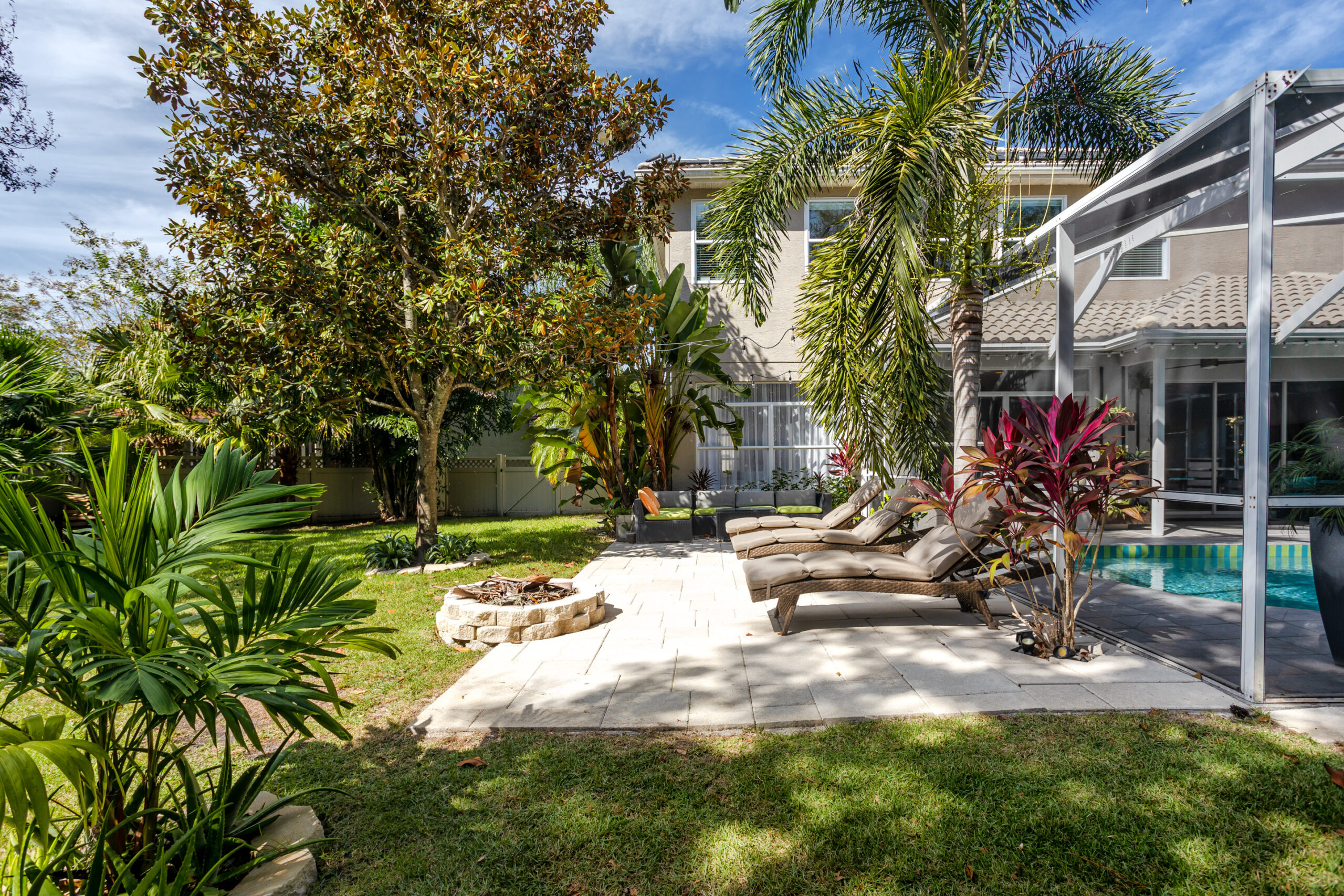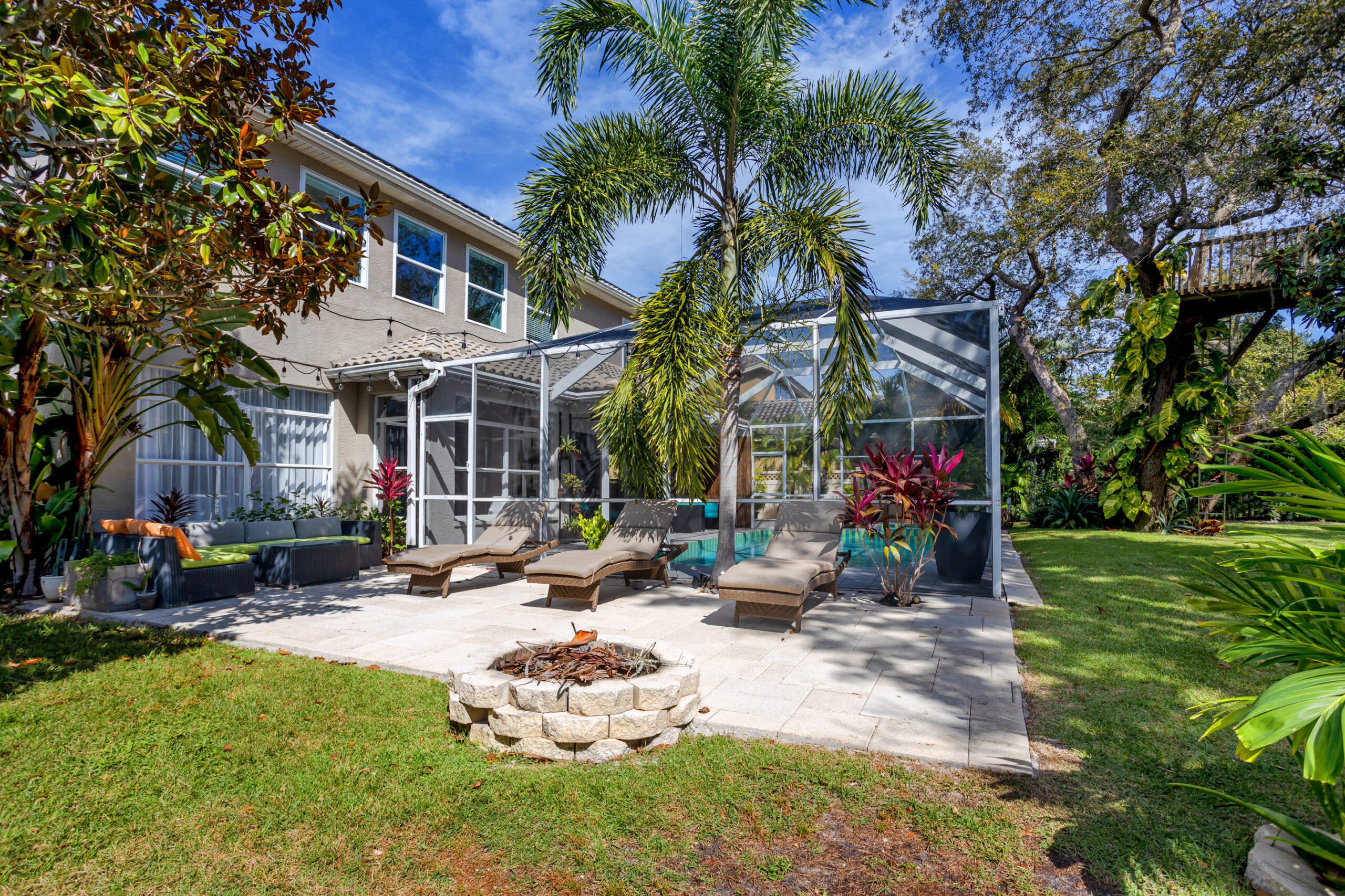 The private backyard is a true retreat, surrounded by lush mature landscaping and featuring a cozy fire pit, sun deck with loungers, and an inviting seating area — perfect for outdoor relaxation and entertaining.