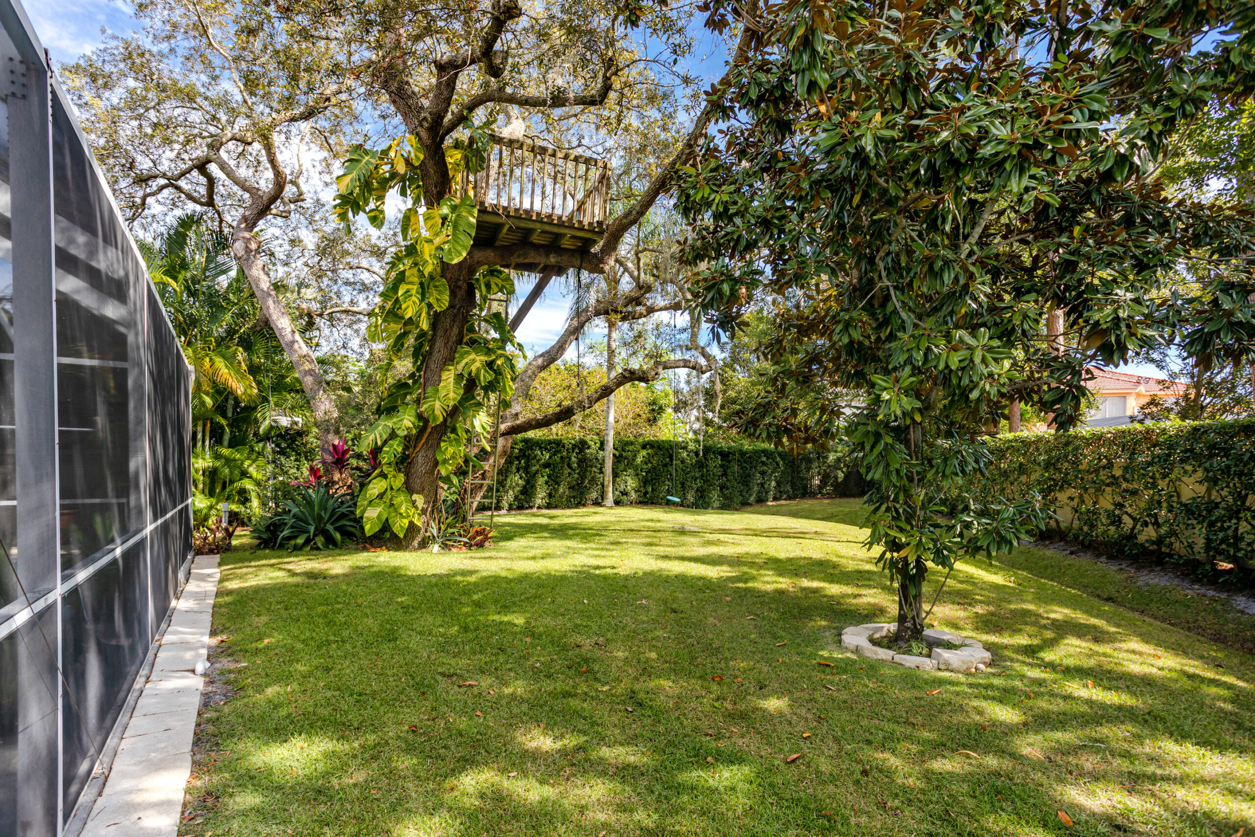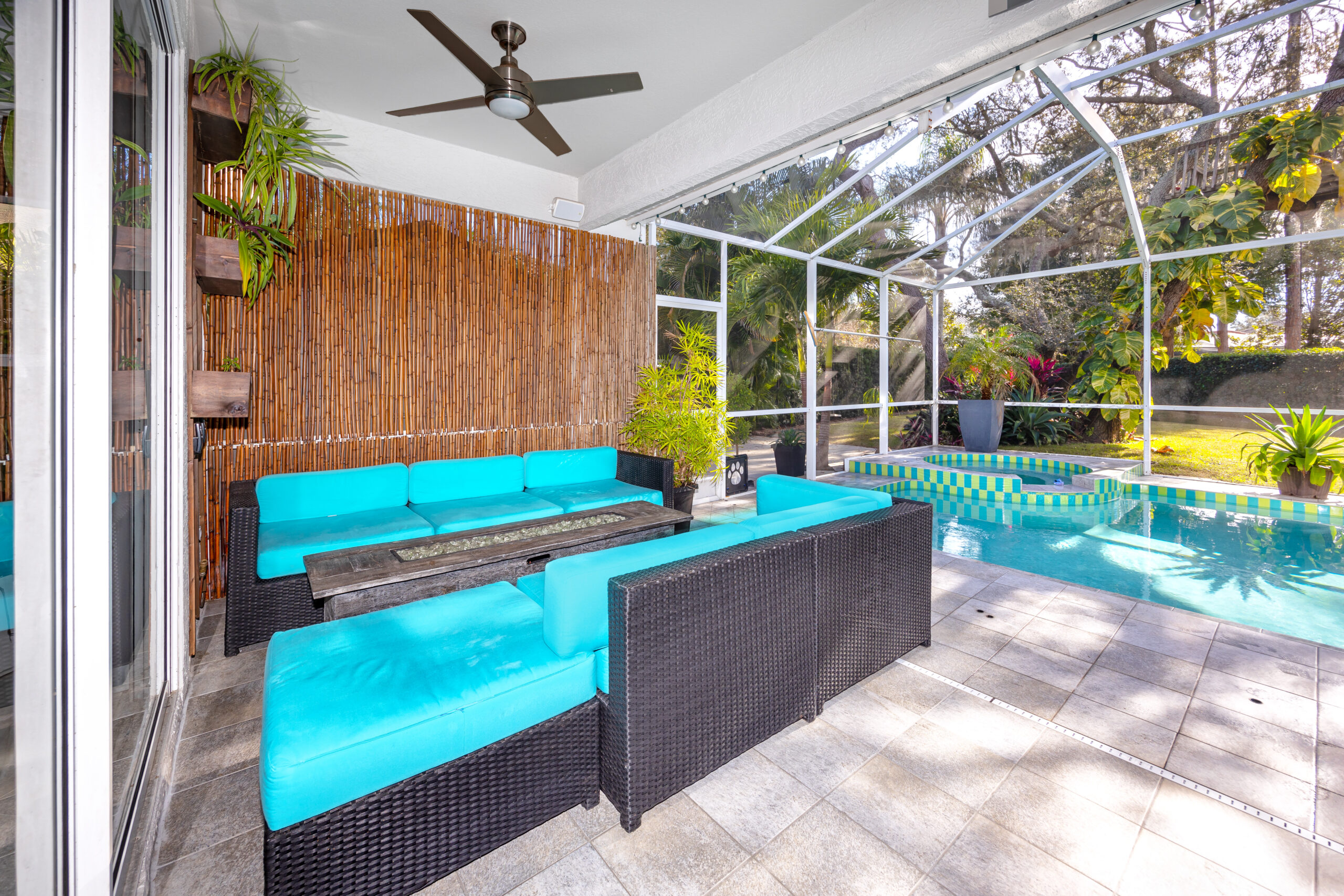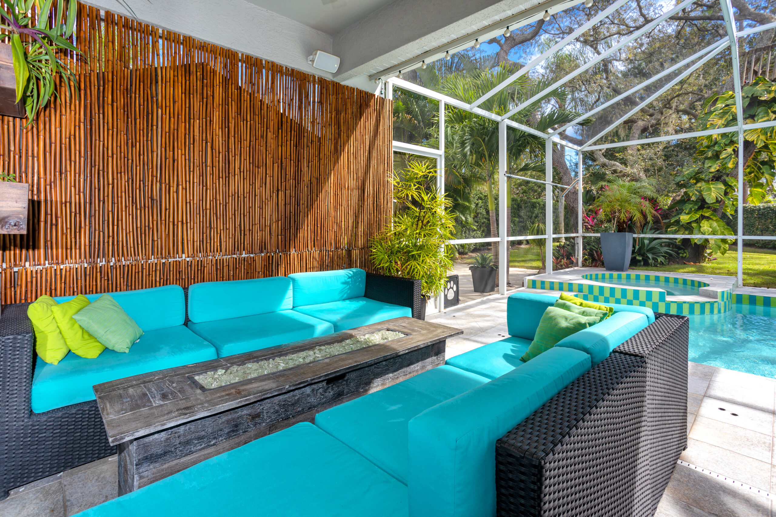 The private backyard is a true retreat, surrounded by lush mature landscaping and featuring a cozy fire pit, sun deck with loungers, and an inviting seating area — perfect for outdoor relaxation and entertaining.